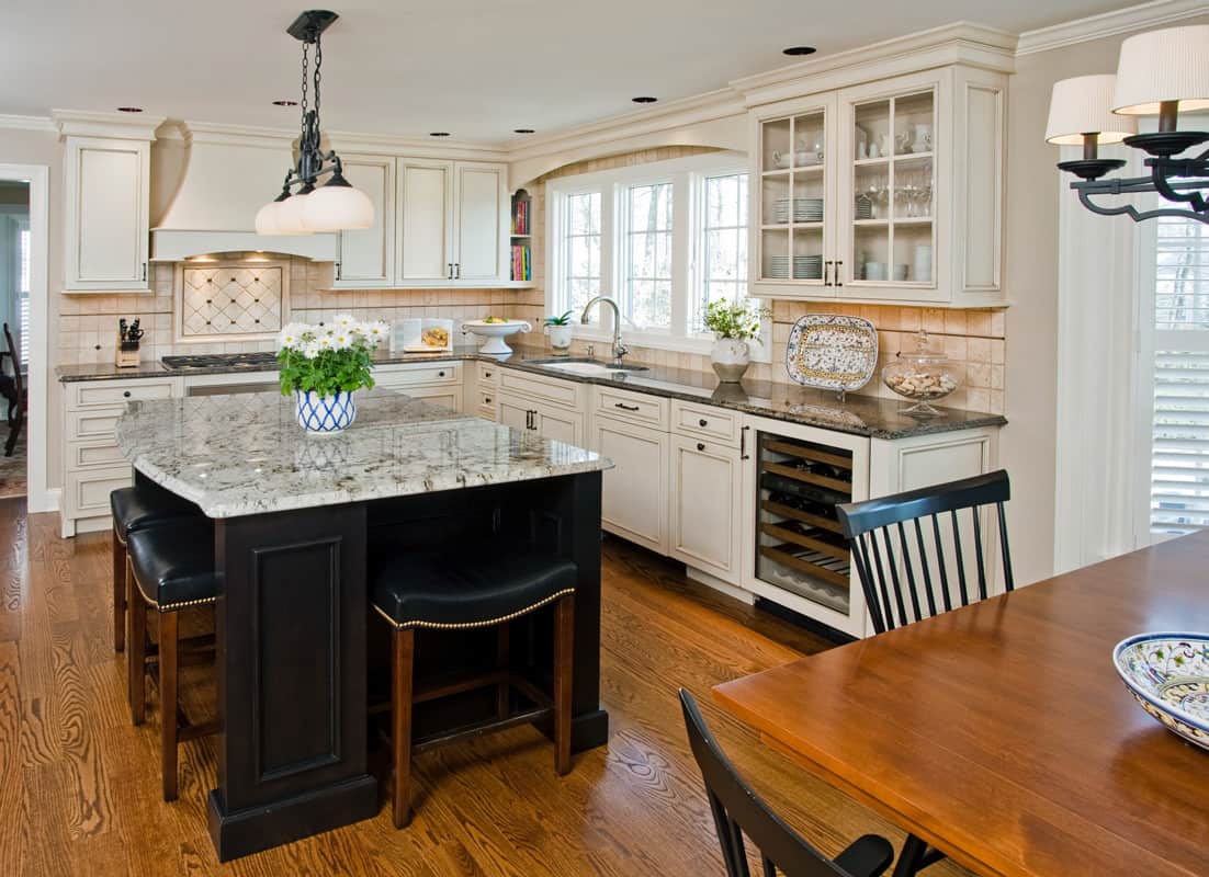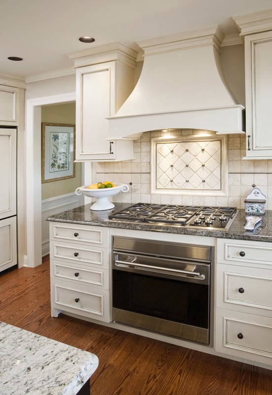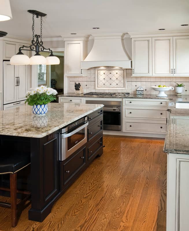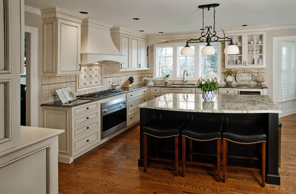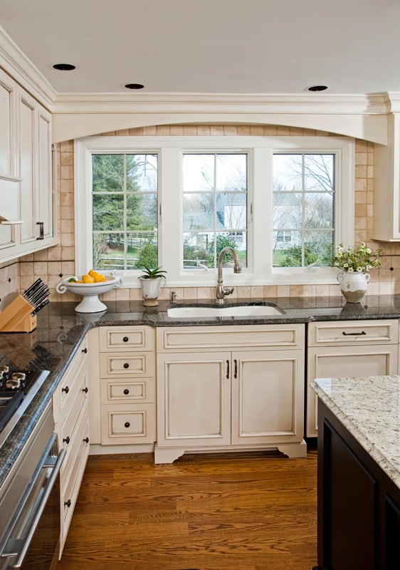 Designing a new kitchen within the original footprint can bring both challenges and opportunities. Working closely with the client to evaluate their needs and desires based on how they function from day to day helps determine the best solution for their lifestyle. The original kitchen was dark and dreary so our first order of business was to transform the layout and open up the window area as much as possible, providing natural light and a view of the yard. Storage was a big priority so we designed a very usable kitchen with easy access to every nook and cranny, creating a utilitarian solution in an aesthetically appealing space. We left ample room between the oversized island and the cabinets for people to cook or congregate without feeling crowded, while incorporating additional elements such as adjustable roll out shelves and deep drawers for easily accessible storage with no wasted space. Soft and warm lighting enhances the overall atmosphere, completing this welcome addition to a beautiful home.