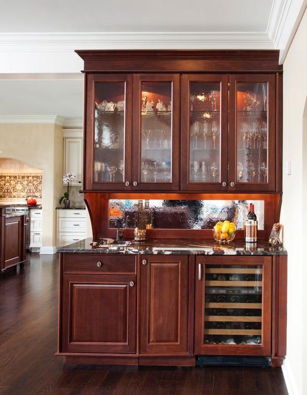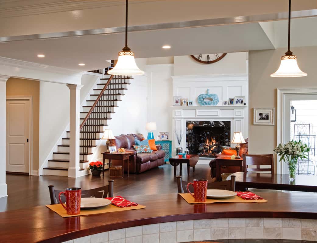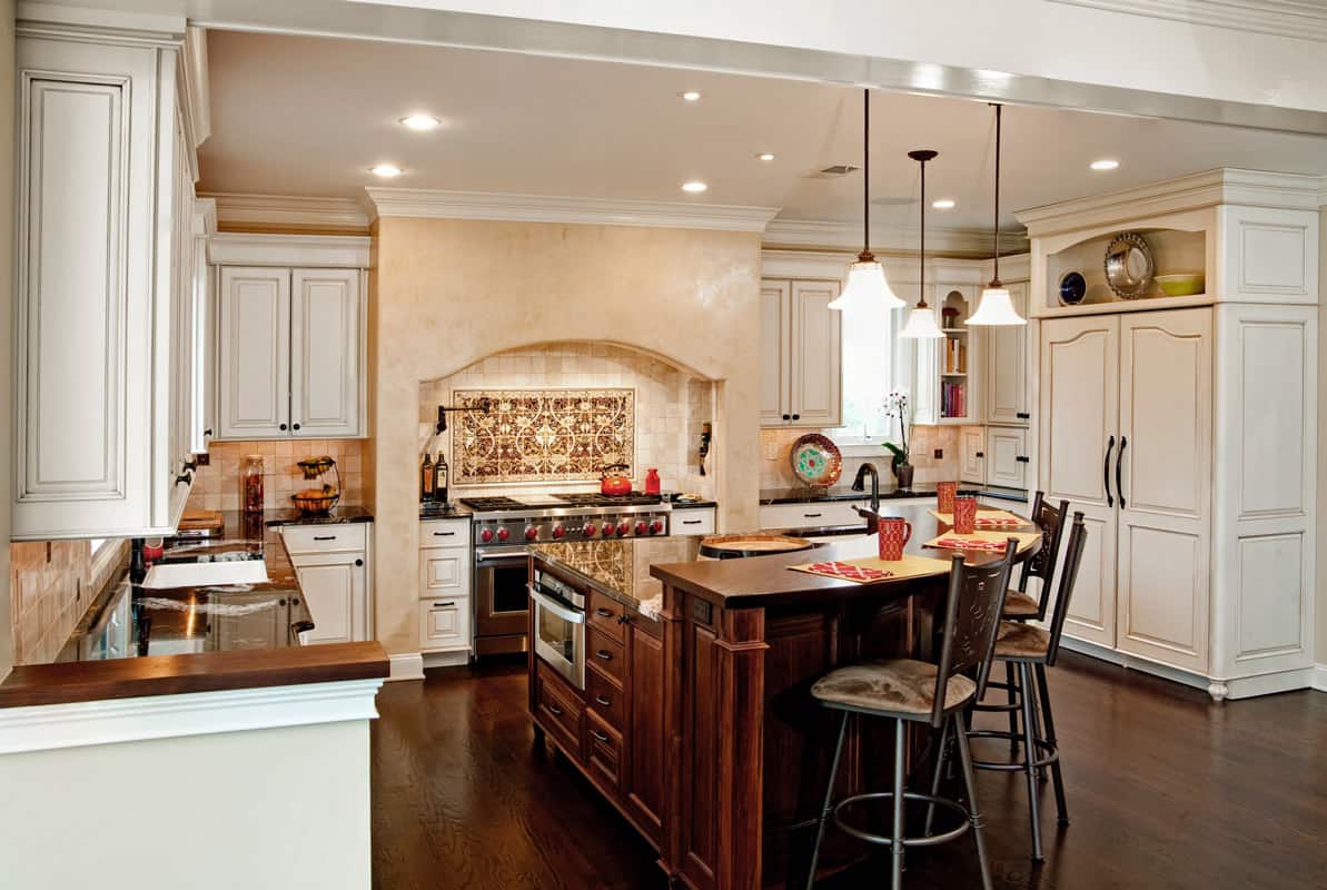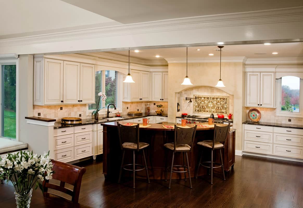 Originally in a different location, this transitional kitchen was part of an entire home renovation. Blending classic style, modern living, and casual comfort, the open floor plan fits in with the client’s love of entertaining while also accommodating their family lifestyle. Whether it’s morning coffee and conversation or parties that gravitate to the kitchen, this layout is ideal. The curved radius of the counter island offers a welcoming setting, while also creating a visual boundary for the cook. Additional curved elements such as the range alcove, window heads, and balcony serve as focal points.Each client brings a unique perspective to their kitchen re-design, and this project was a culmination of client, kitchen designer, and contractor working cohesively to create a beautiful and functional space.