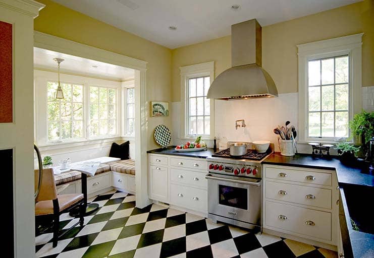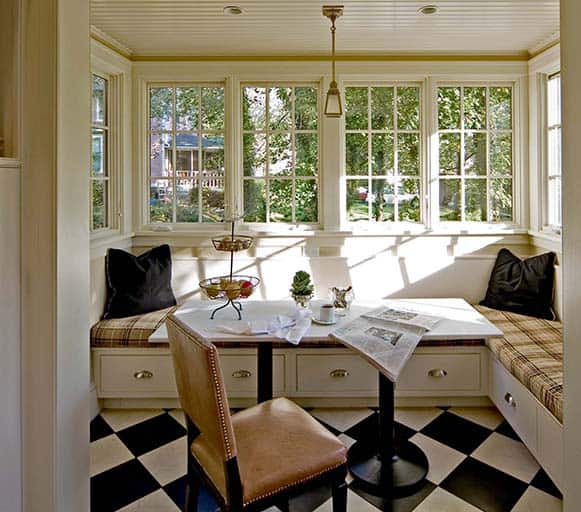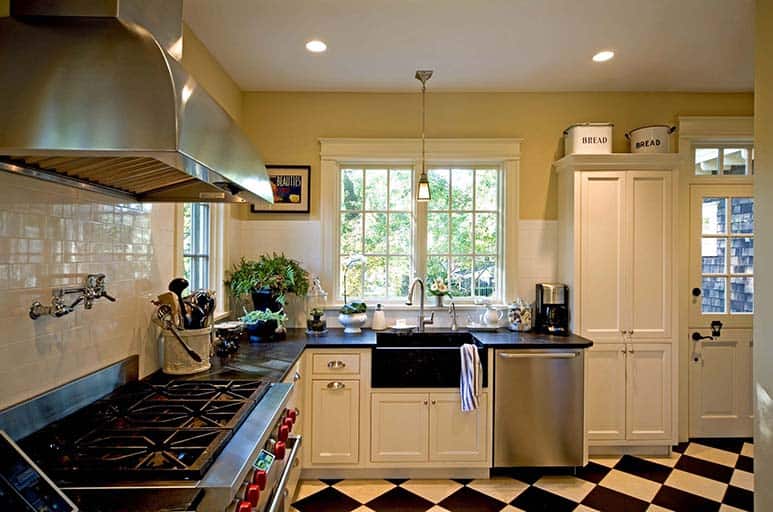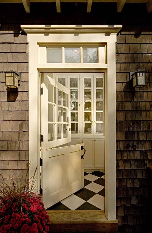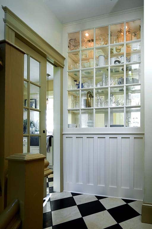 This was a very unique project for us due to it being a small kitchen with a disconnected side porch. With no real sense of flow, the challenge was to create a cohesive, functional, and beautiful space with the existing footprint. Our solution was to close in the side porch off the kitchen and match the cedar shake siding in keeping with the existing home. With the interior space now larger, we were able to create a banquette sitting area. Unlike most of the kitchens we build, this client just wanted windows in the place where upper cabinets typically go. This left a quandary for storage, so we built a creatively concealed pantry space. In addition, we took the back of the butler’s pantry and replaced it with a display cabinet with antique glass windowpanes, allowing the light to come through.