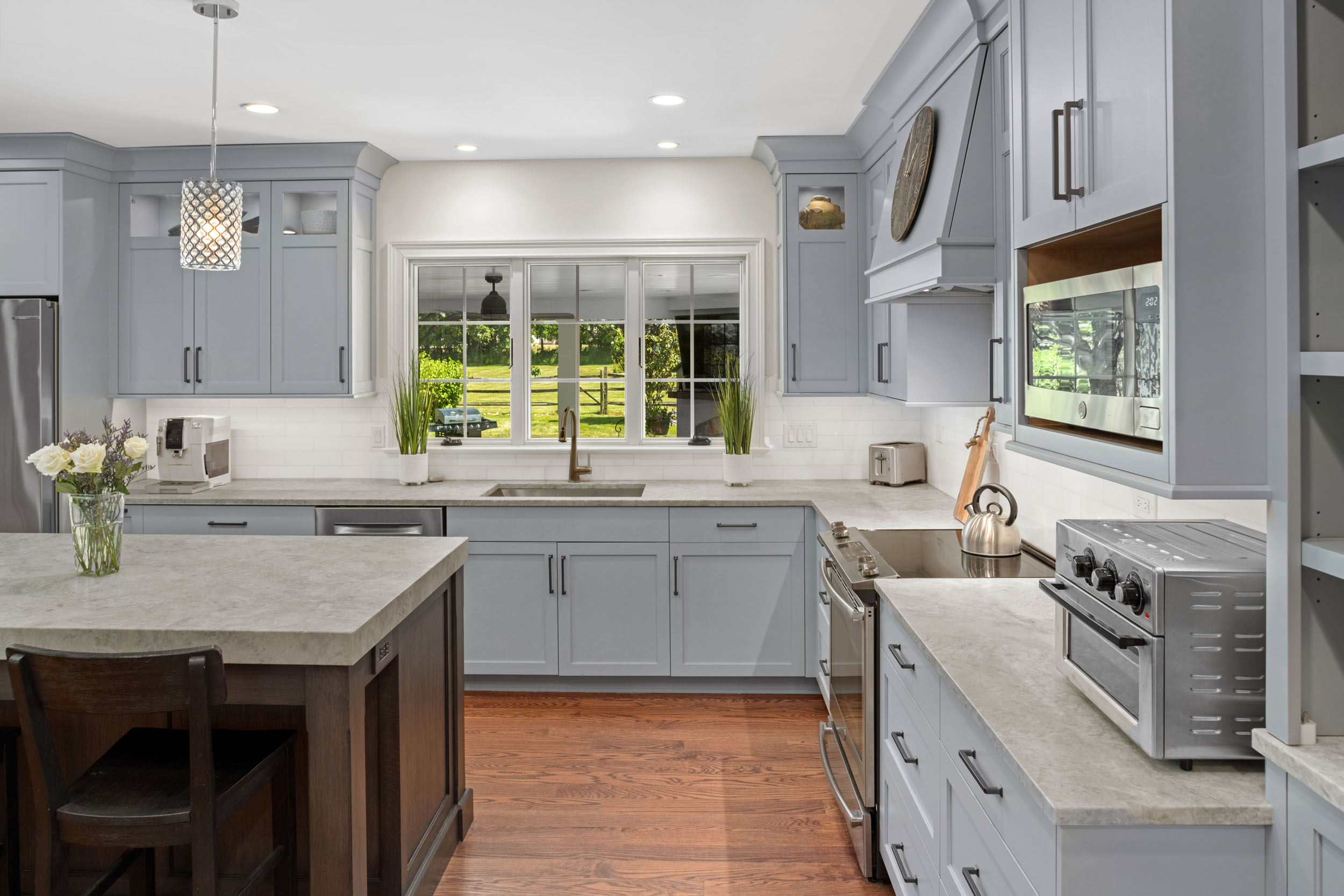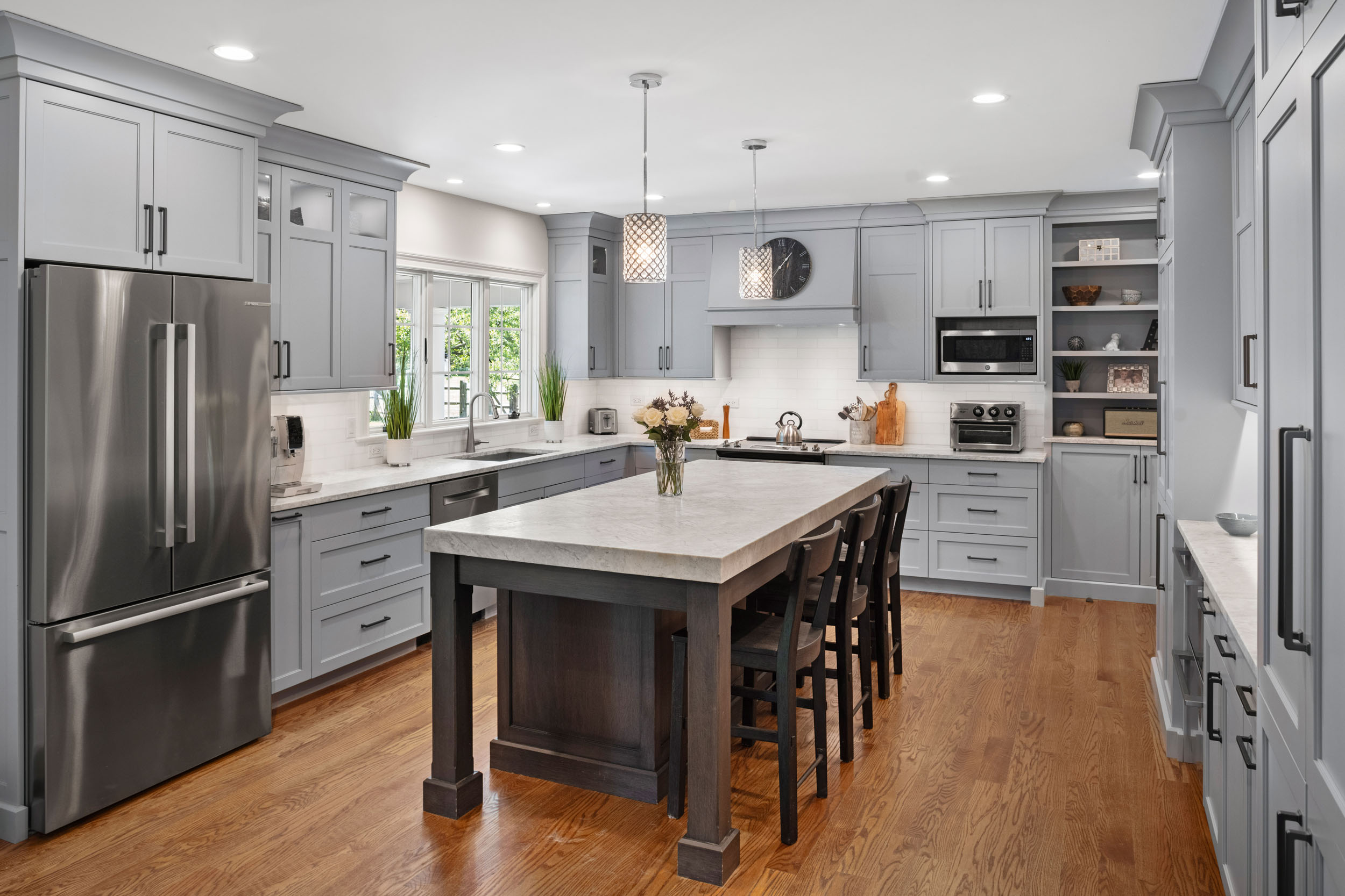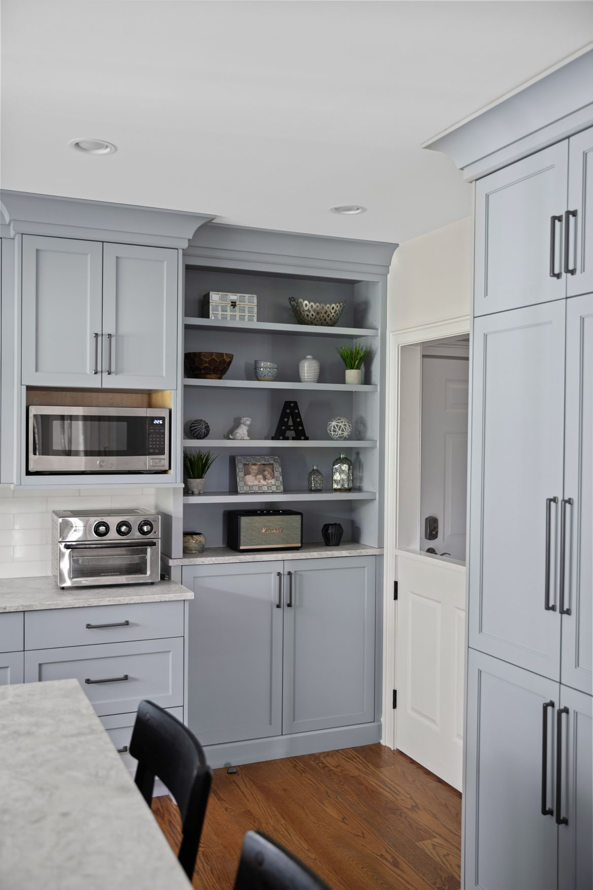 A renovation doesn’t always need to involve major construction changes in order to transform it into a showpiece. Everything in this kitchen stayed relatively close to the existing footprint, yet we were able to attain a dramatic change and a big reveal. One goal was to increase storage space as much as possible. Working within the existing square footage, we made smart changes to the layout, including removing the walk-in pantry. We built cabinetry along an entire wall instead, resulting in a more spacious feel, while also providing plenty of storage. As some of the “children” of our clients have four legs and a tail, an additional feature of the large center island incorporates a large roll-out with a dedicated area for dog food containers. Adding an accent color on the walls added a refreshing touch to the aesthetic presentation overall and everyone was happy, including the pups!