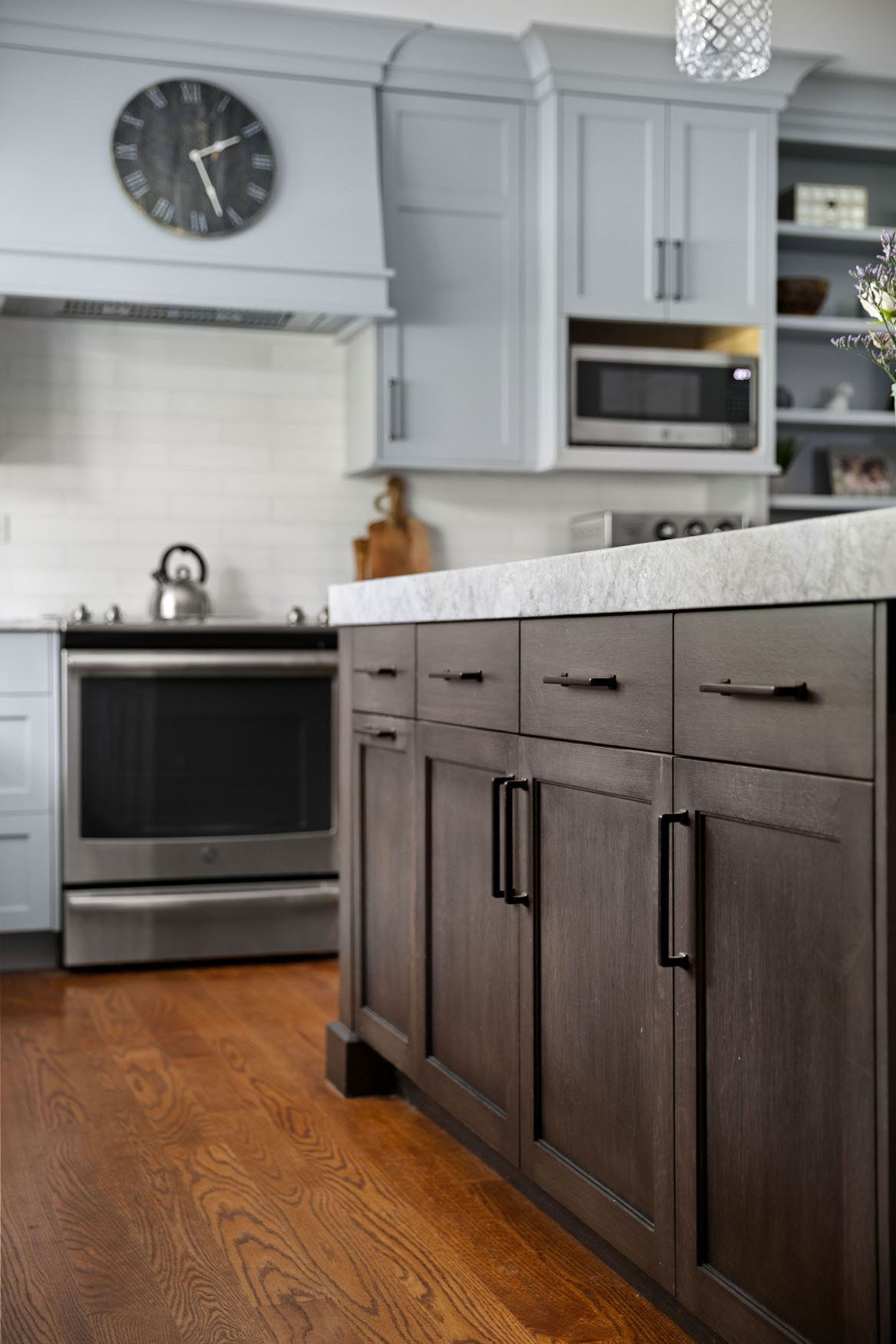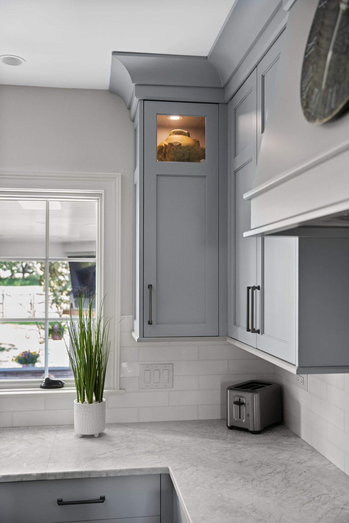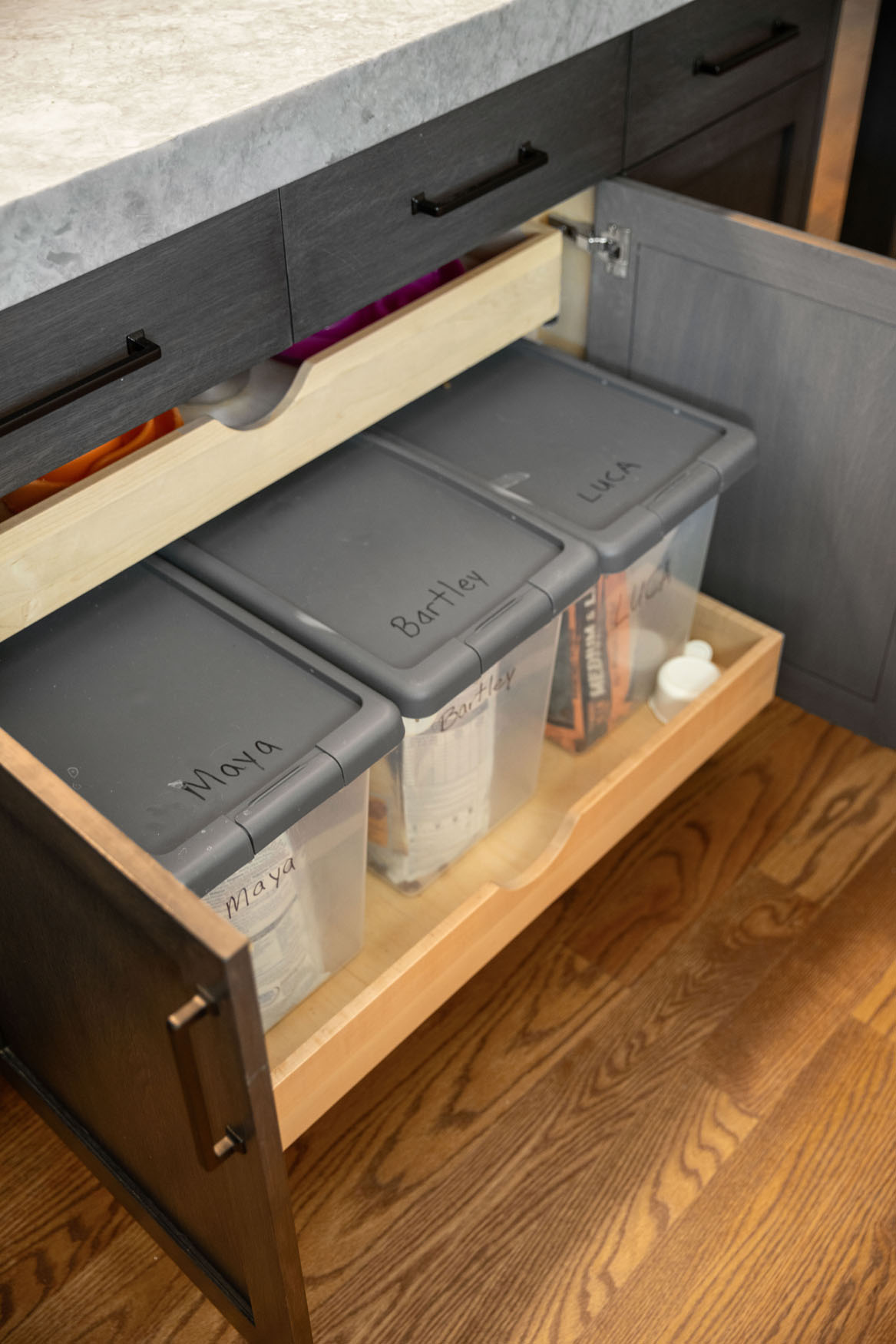A renovation doesn’t always need to involve major construction changes in order to transform it into a showpiece. Everything in this kitchen stayed relatively close to the existing footprint, yet we were able to attain a dramatic change and a big reveal. One goal was to increase storage space as much as possible. Working within the existing square footage, we made smart changes to the layout, including removing the walk-in pantry. We built cabinetry along an entire wall instead, resulting in a more spacious feel, while also providing plenty of storage. As some of the “children” of our clients have four legs and a tail, an additional feature of the large center island incorporates a large roll-out with a dedicated area for dog food containers. Adding an accent color on the walls added a refreshing touch to the aesthetic presentation overall and everyone was happy, including the pups!