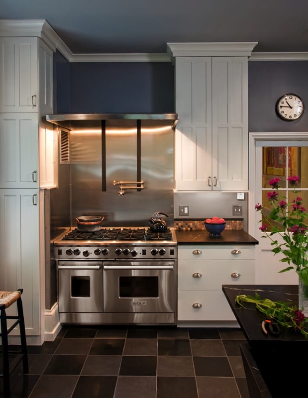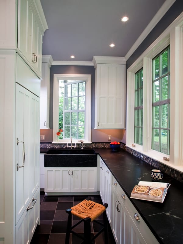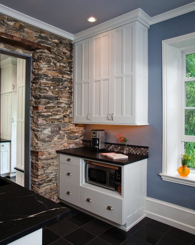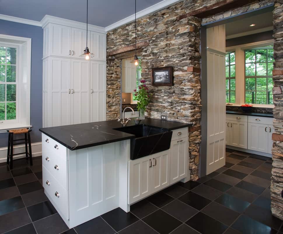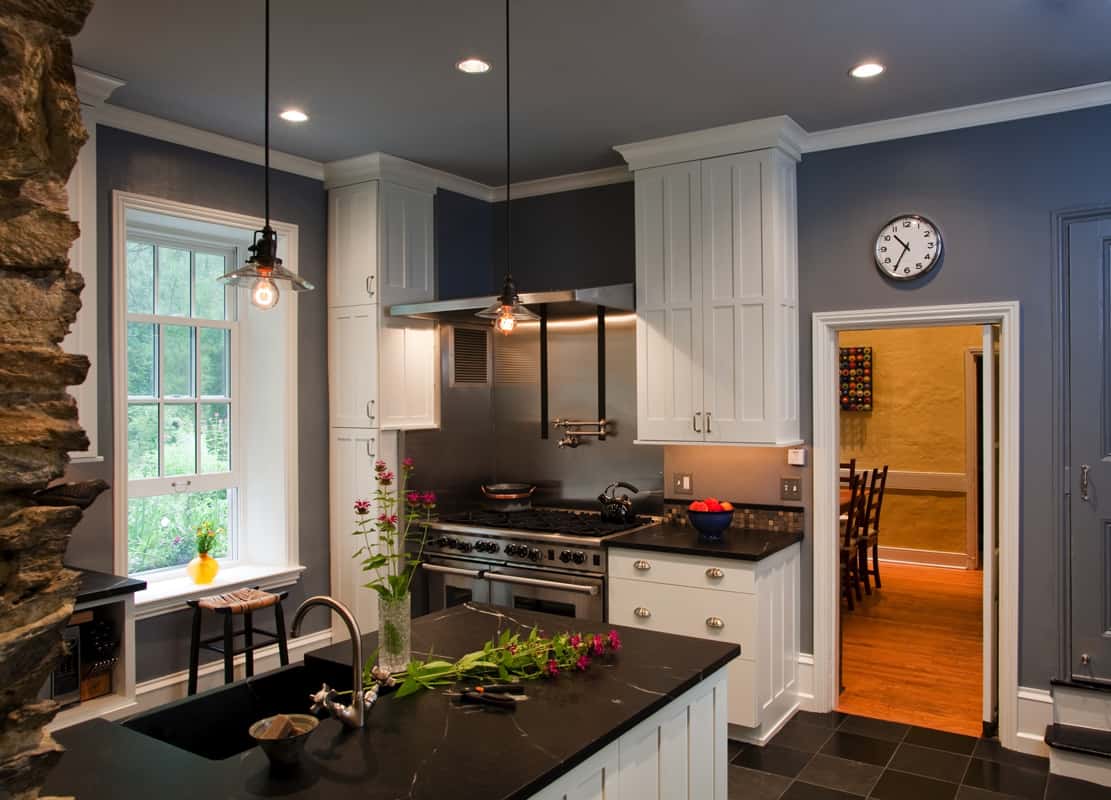 The kitchen in this 1860’s Italianate style architecture home was unique in its layout, with extensive cabinetry throughout and unexpected surfaces found during renovations. Working with the client, the kitchen designer, and our team, we applied the best solutions for challenges presented. The existing interior space was small, so we reoriented the entrance, incorporated the mudroom into the entry area, exposed the interior stone wall, and rebuilt the porch with a new roof and entryway, emphasizing the natural light.Inspiration for the tall linear cabinetry came from the mid 1800’s style door-style built-ins from the original dining room. With the cabinets already built when we discovered the stone wall, we created scribes, sculpting the edge profile of the cabinetry into the stone work. Decorative Edison style lighting added just the right detail, providing a beautiful ambience overall.